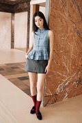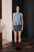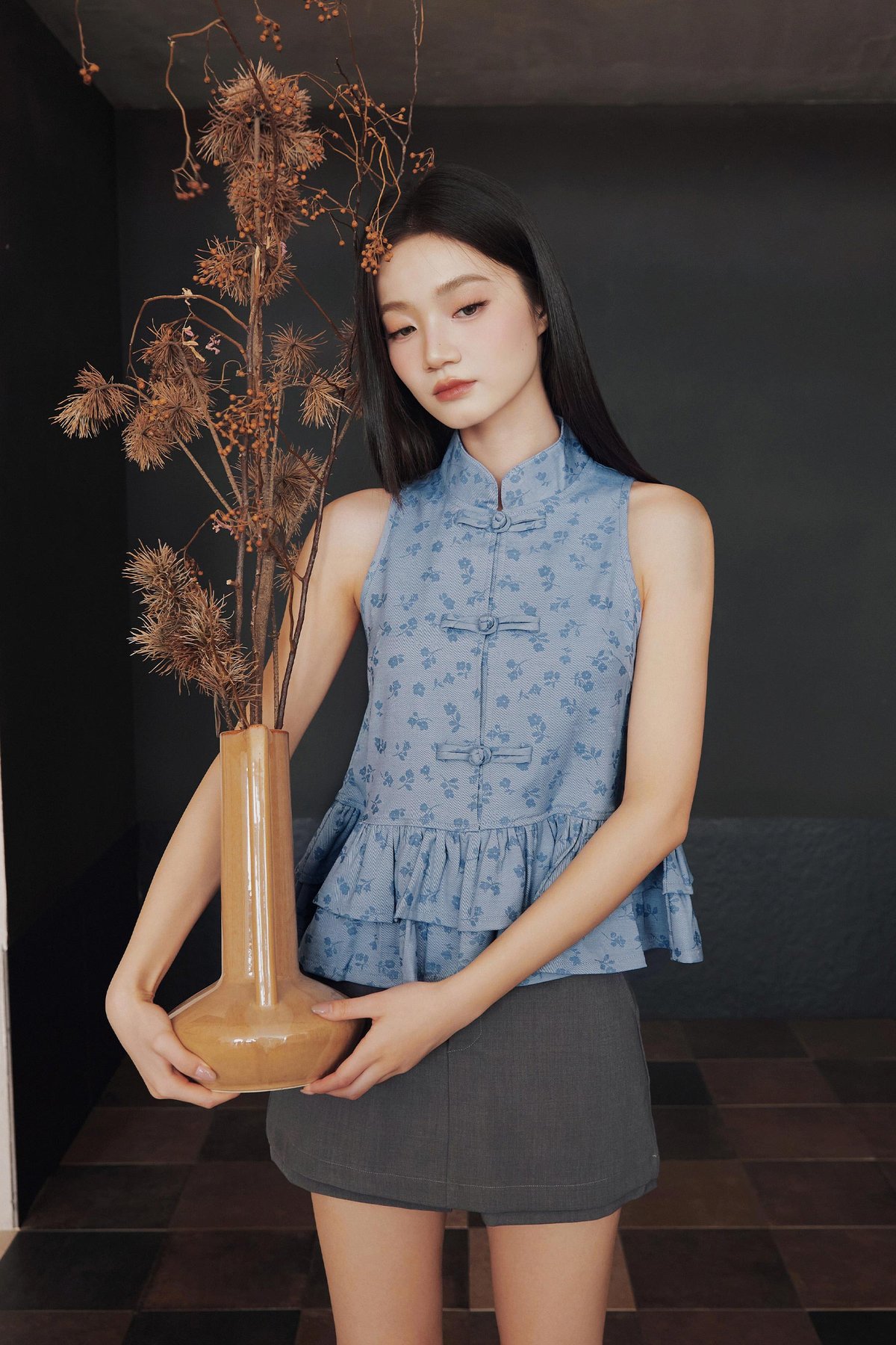 A Cheongsam modern top with a chinese stand collar, functional frog buttons and a double-layered peplum.