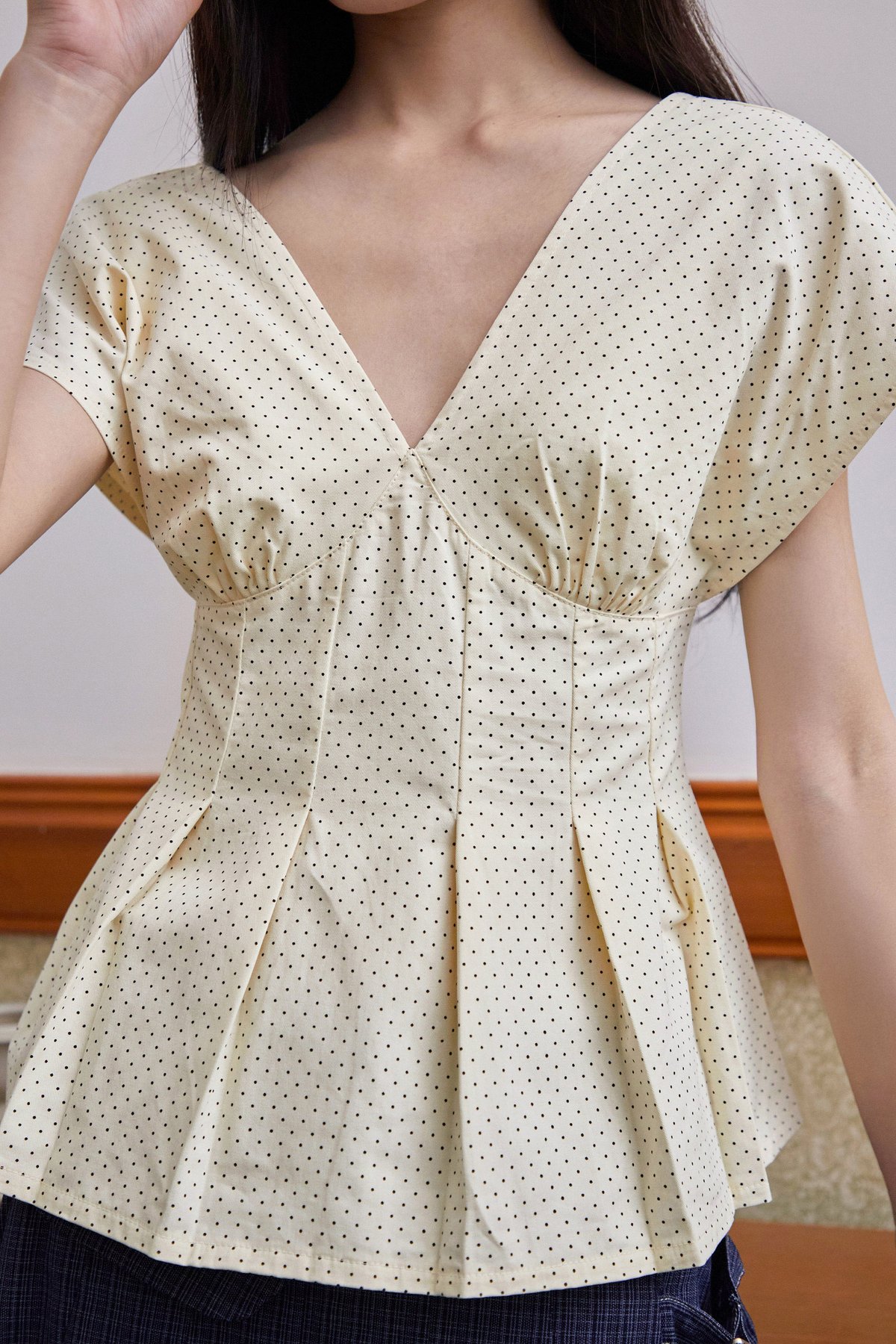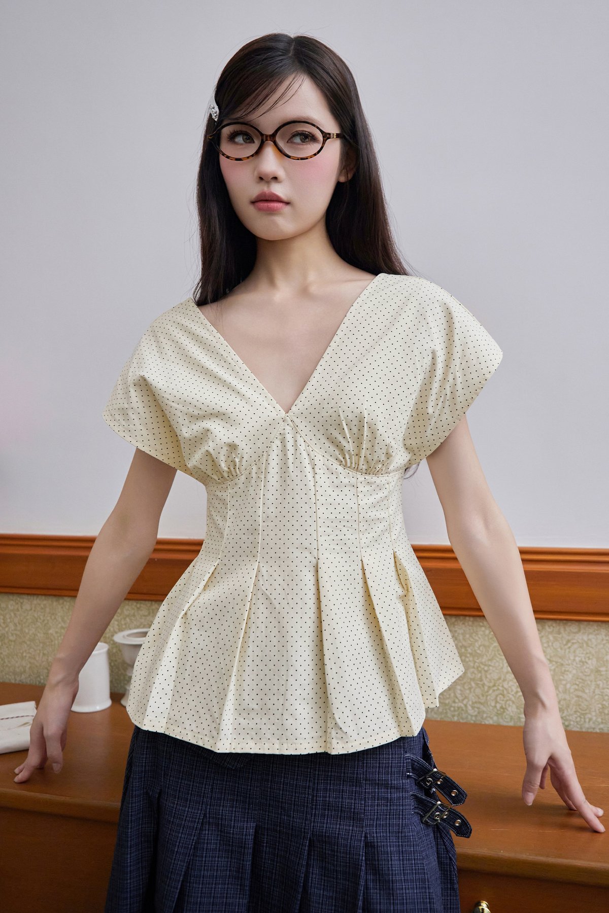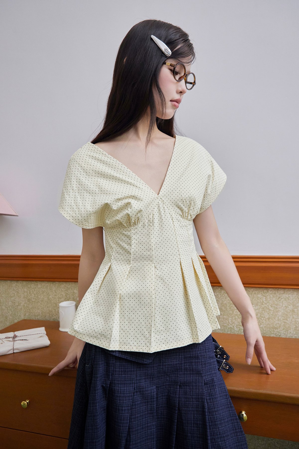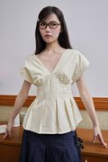 A top lined at the bust, featuring front and back V-necklines, pleated front details, slight bust gathering, and a back concealed zipper.