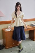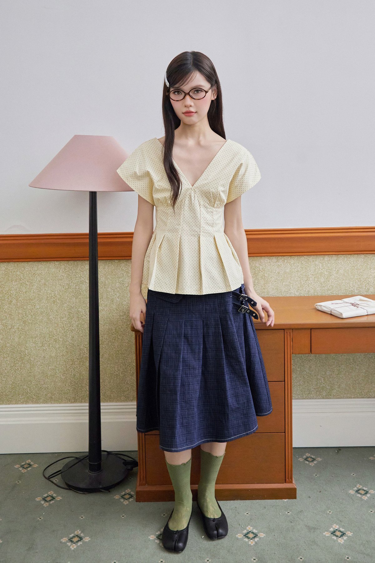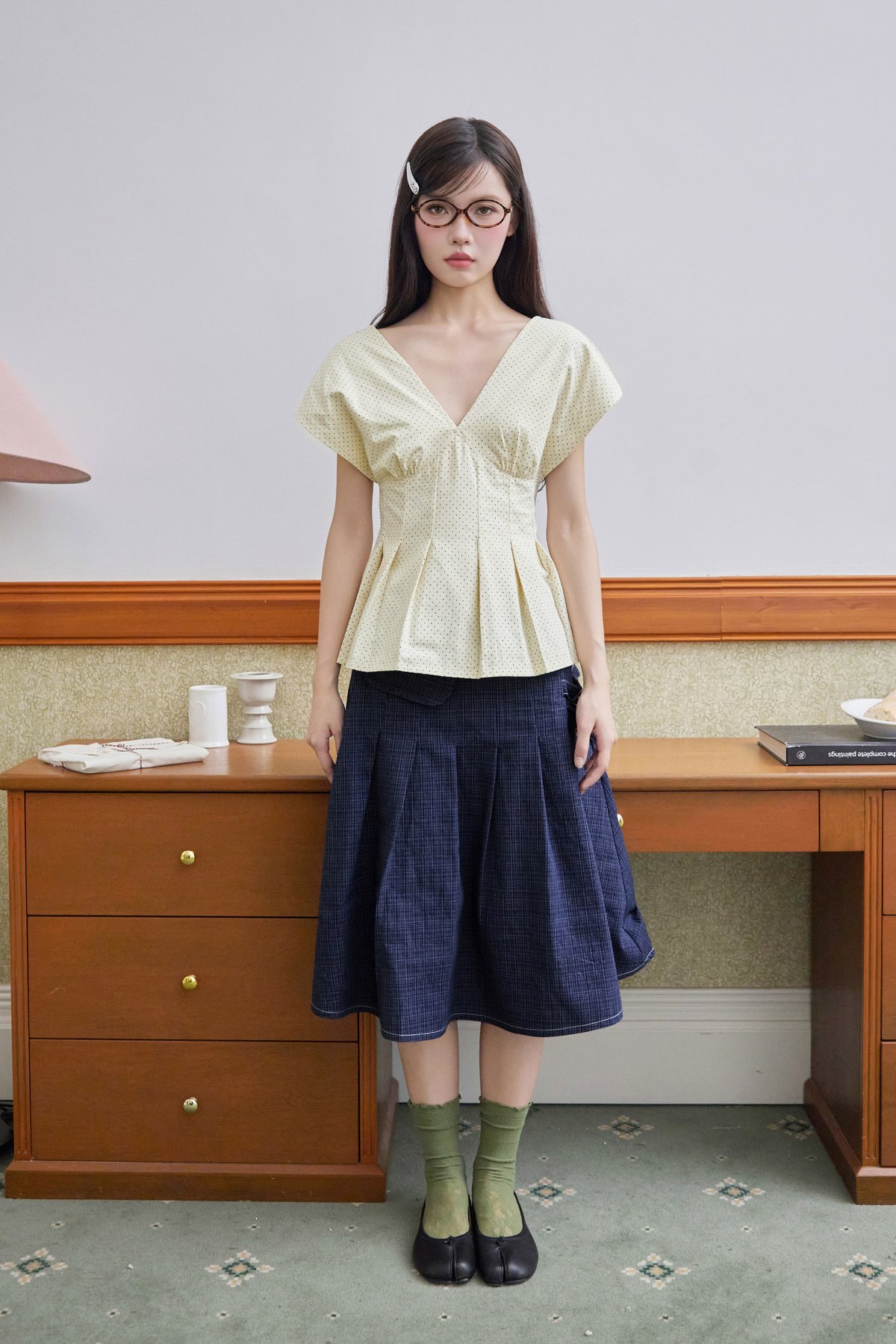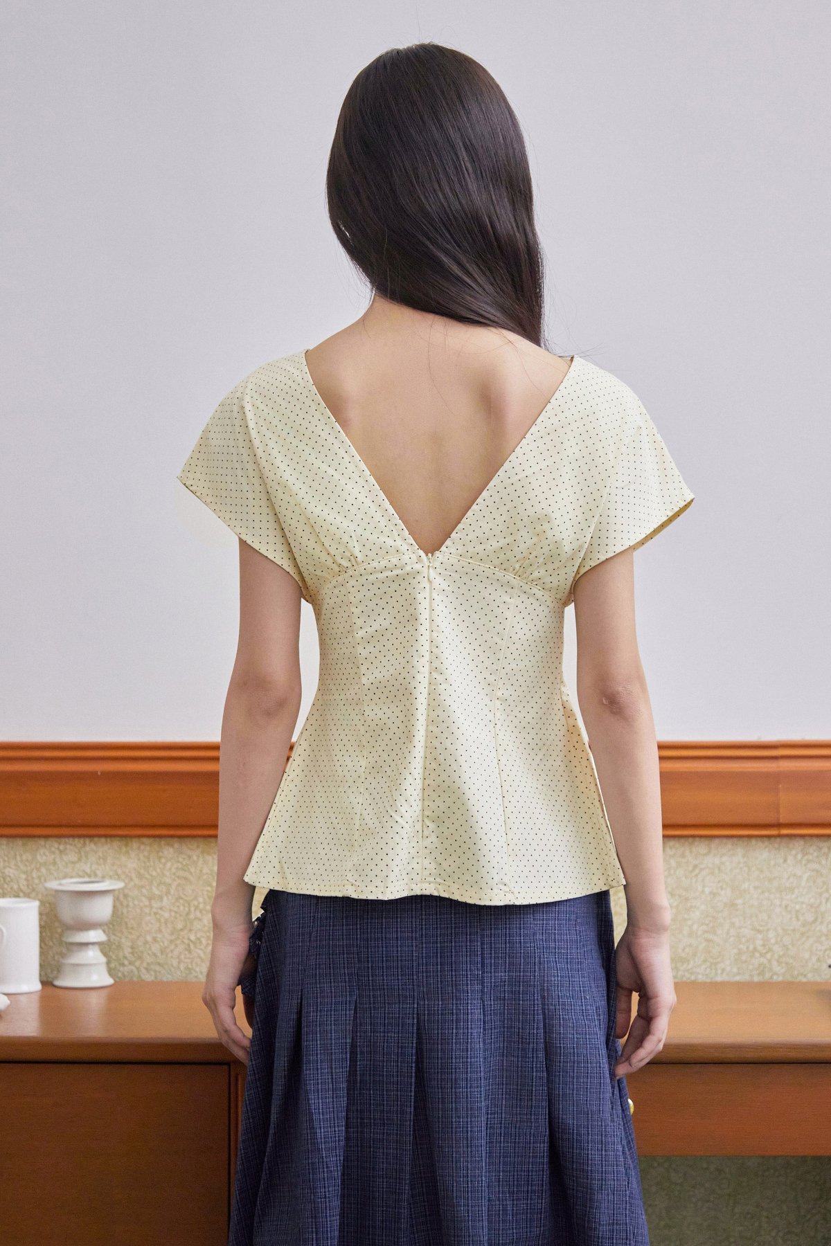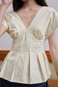 A top lined at the bust, featuring front and back V-necklines, pleated front details, slight bust gathering, and a back concealed zipper.