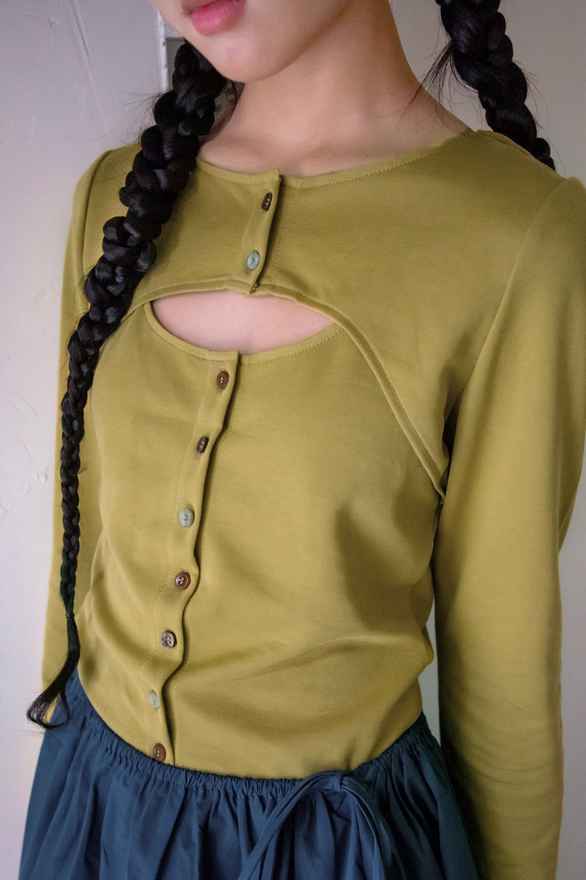 A faux two-piece top with peek-a-boo details at the chest and back, finished with functional front buttons and a slightly stretchable fabric for a comfortable fit.