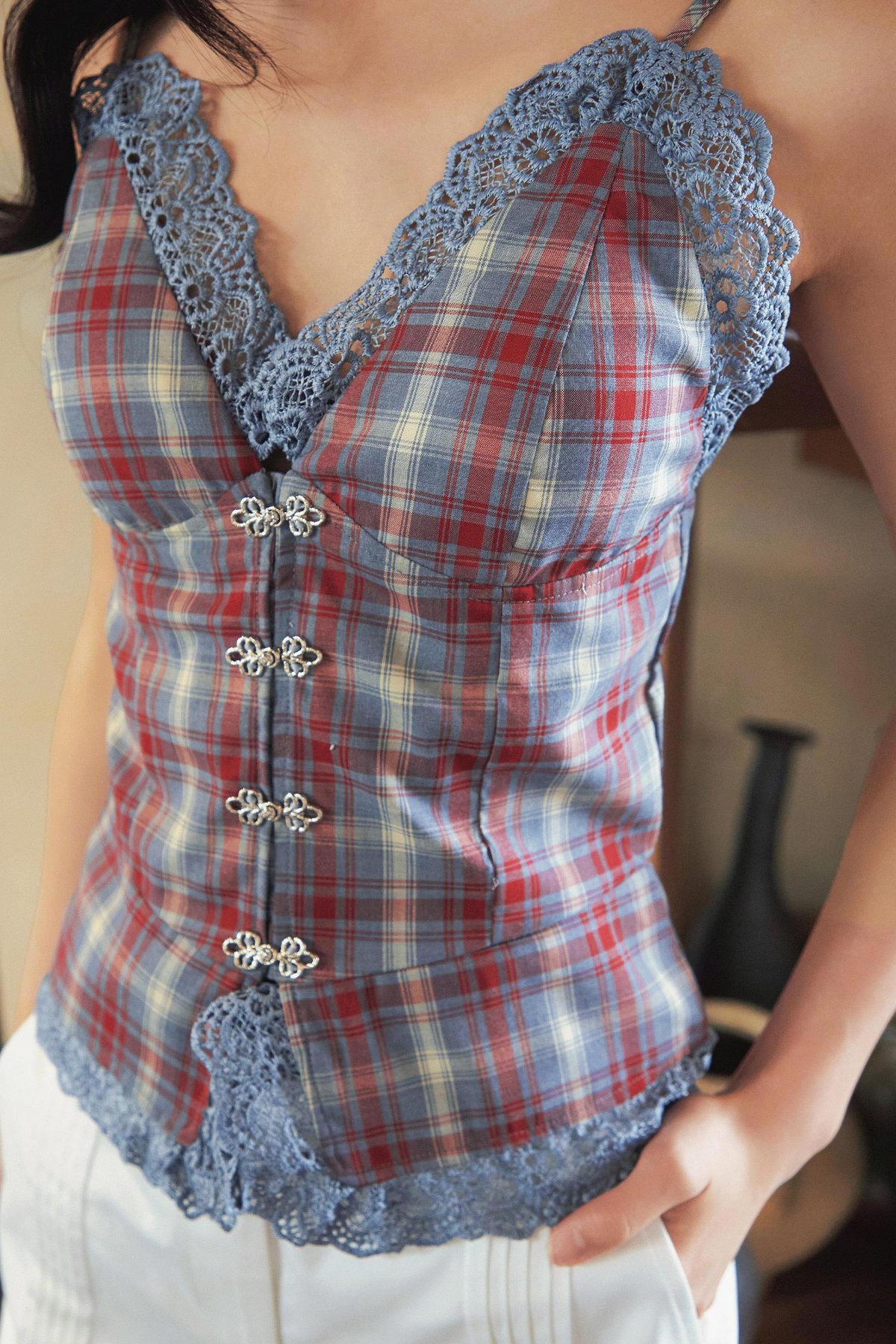 A padded top with adjustable straps, decorative-functional metal hook buttons, and delicate trimmings along the hem and bust cups.