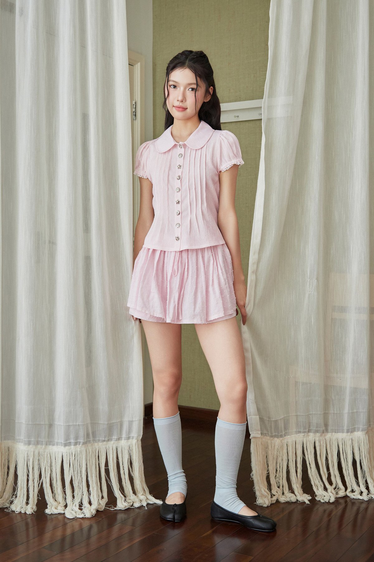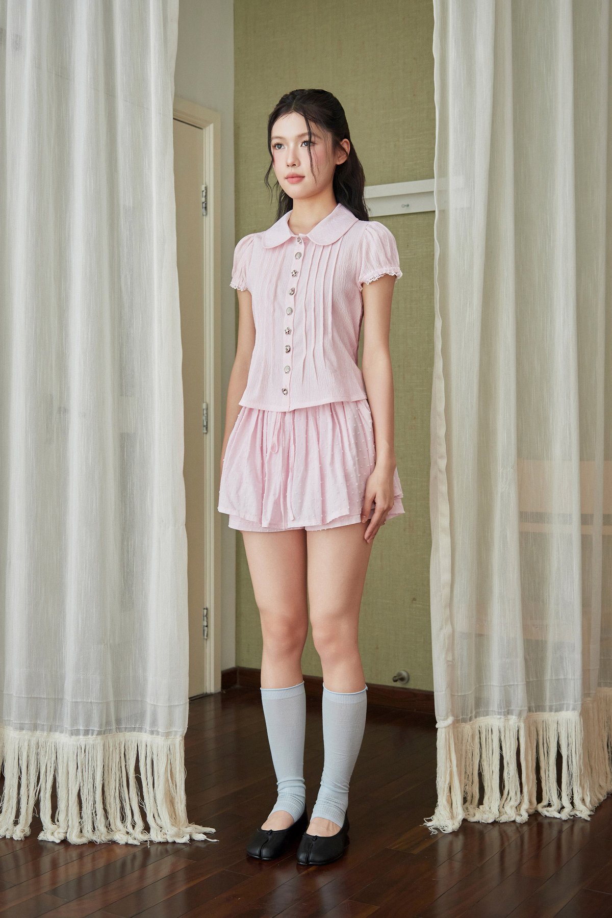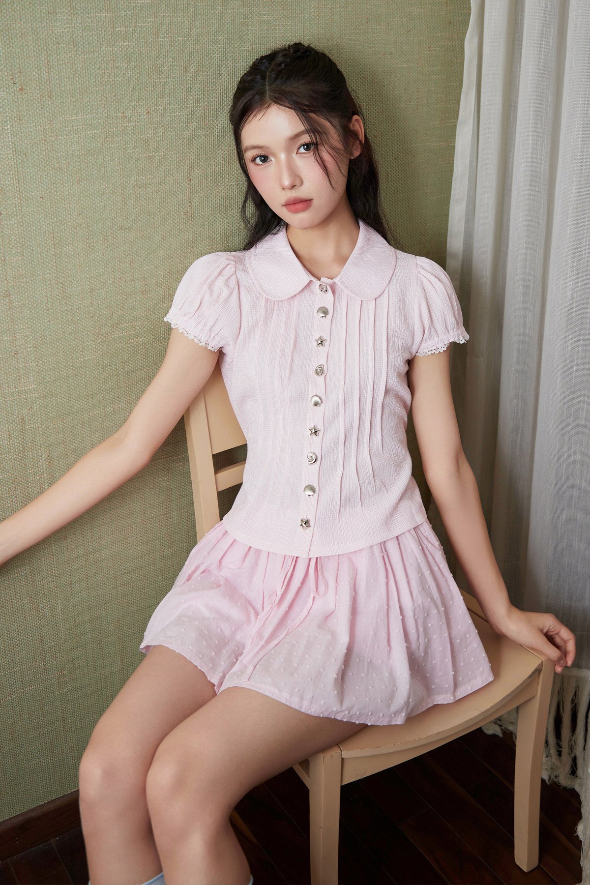 This top features delicate pintuck details and decorative functional buttons along the front. Designed with puff sleeves trimmed at the hems, an elegant Peter Pan collar, and a detachable back ribbon tie to cinch the waist for a flattering fit.