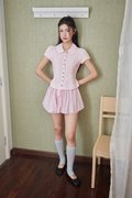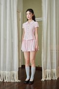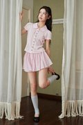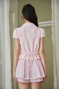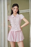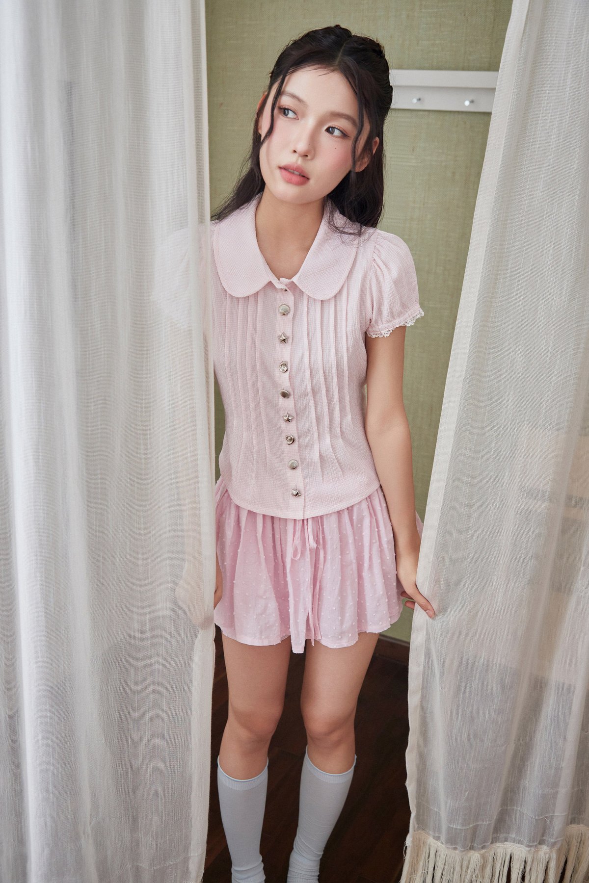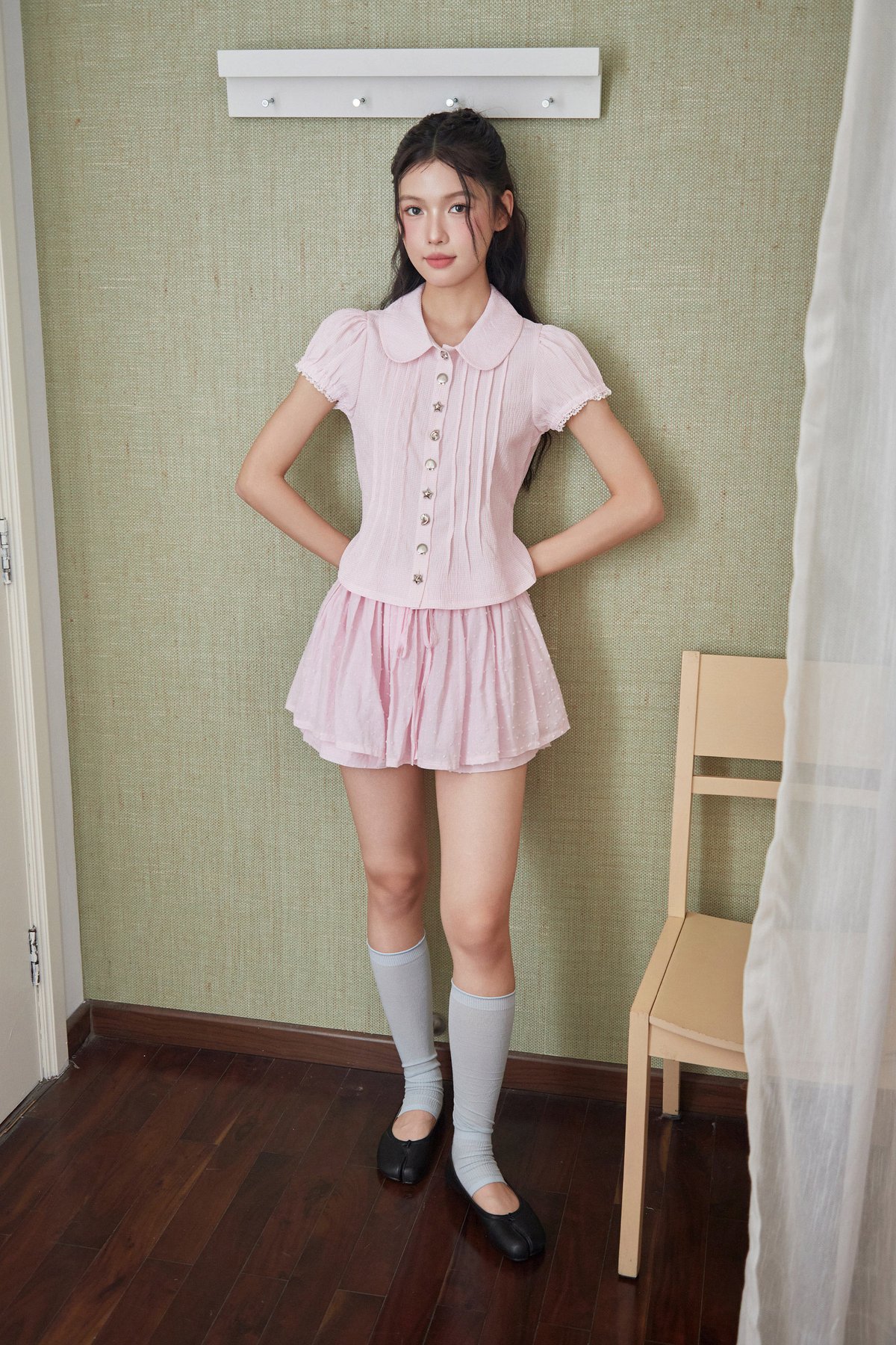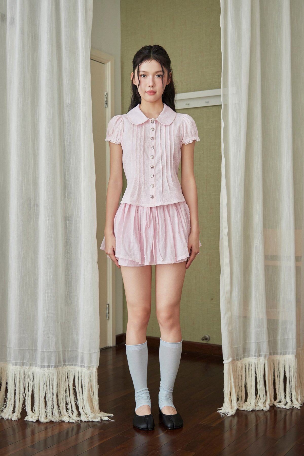 This top features delicate pintuck details and decorative functional buttons along the front. Designed with puff sleeves trimmed at the hems, an elegant Peter Pan collar, and a detachable back ribbon tie to cinch the waist for a flattering fit.