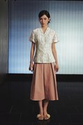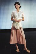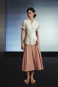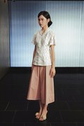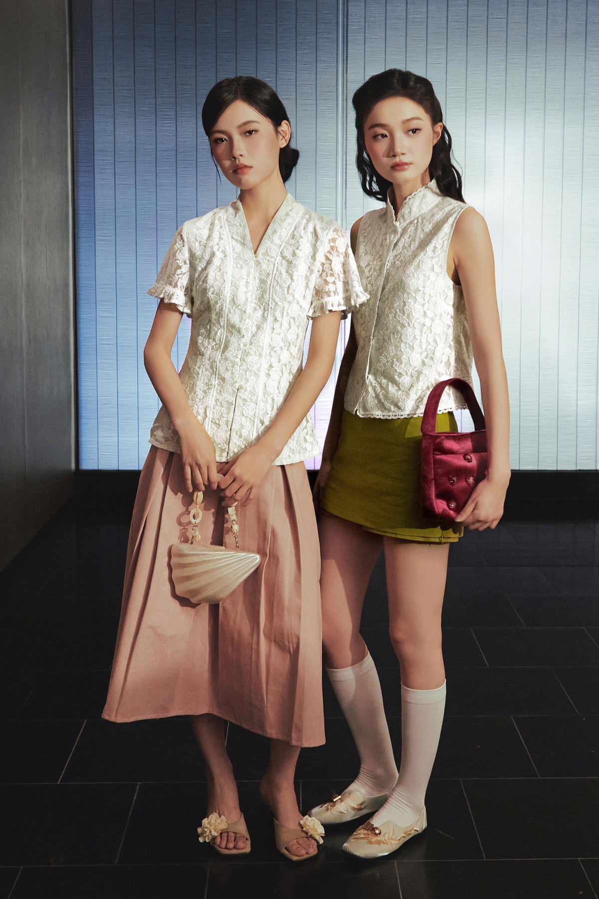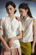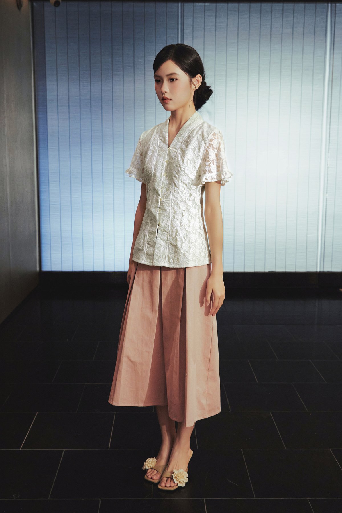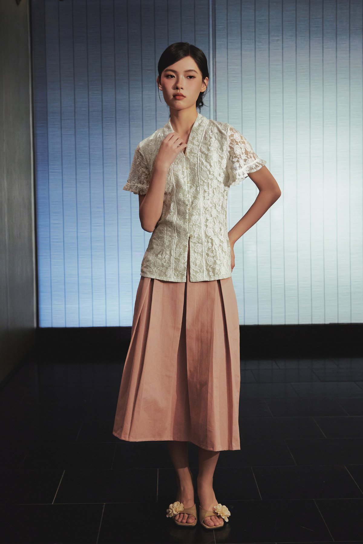 A Nyonya kebaya inspired top, fully lined and cut in a classic kebaya silhouette. Designed with functional front buttons and finished with soft ruffle details at the sleeve hems for a feminine touch.