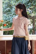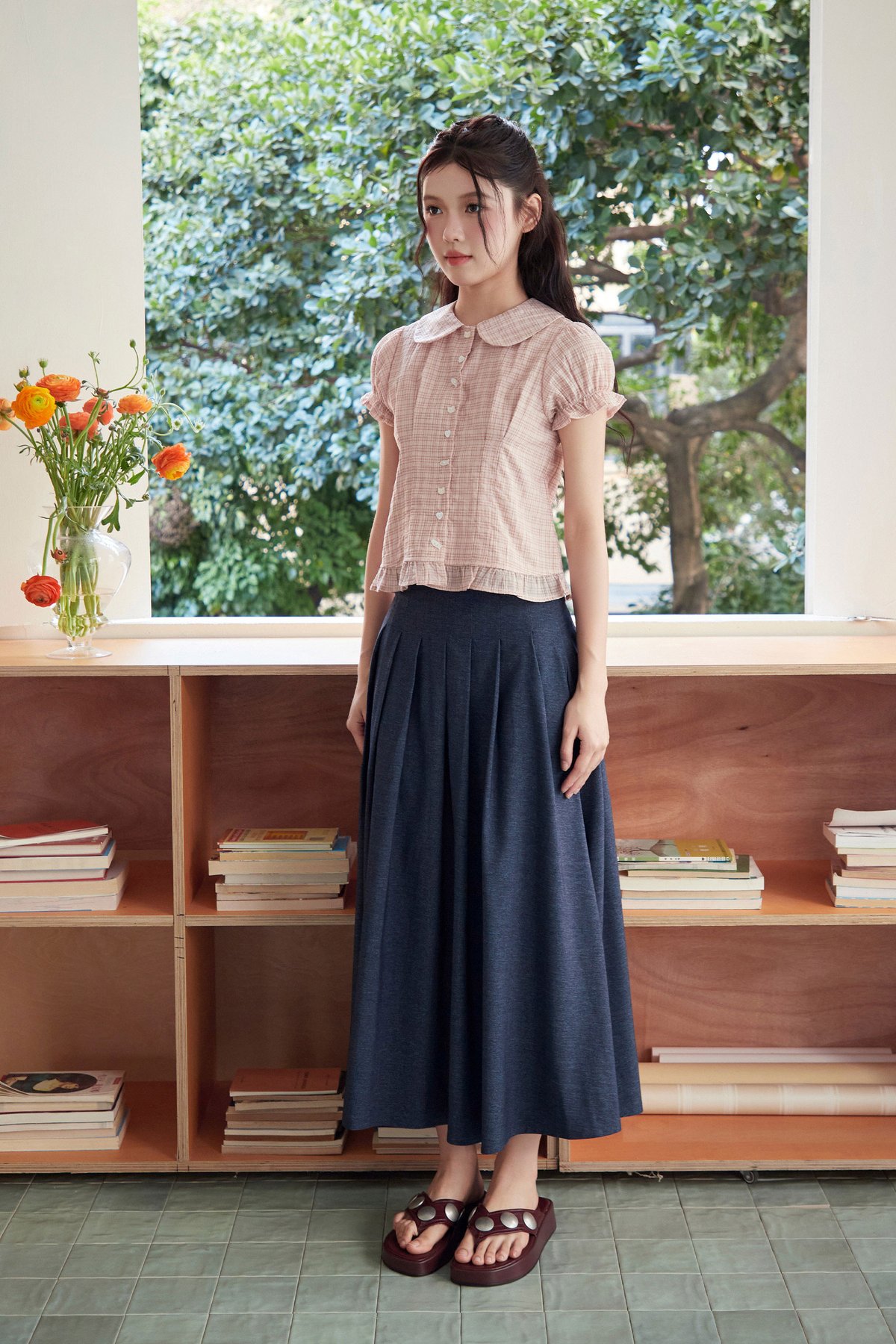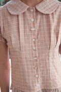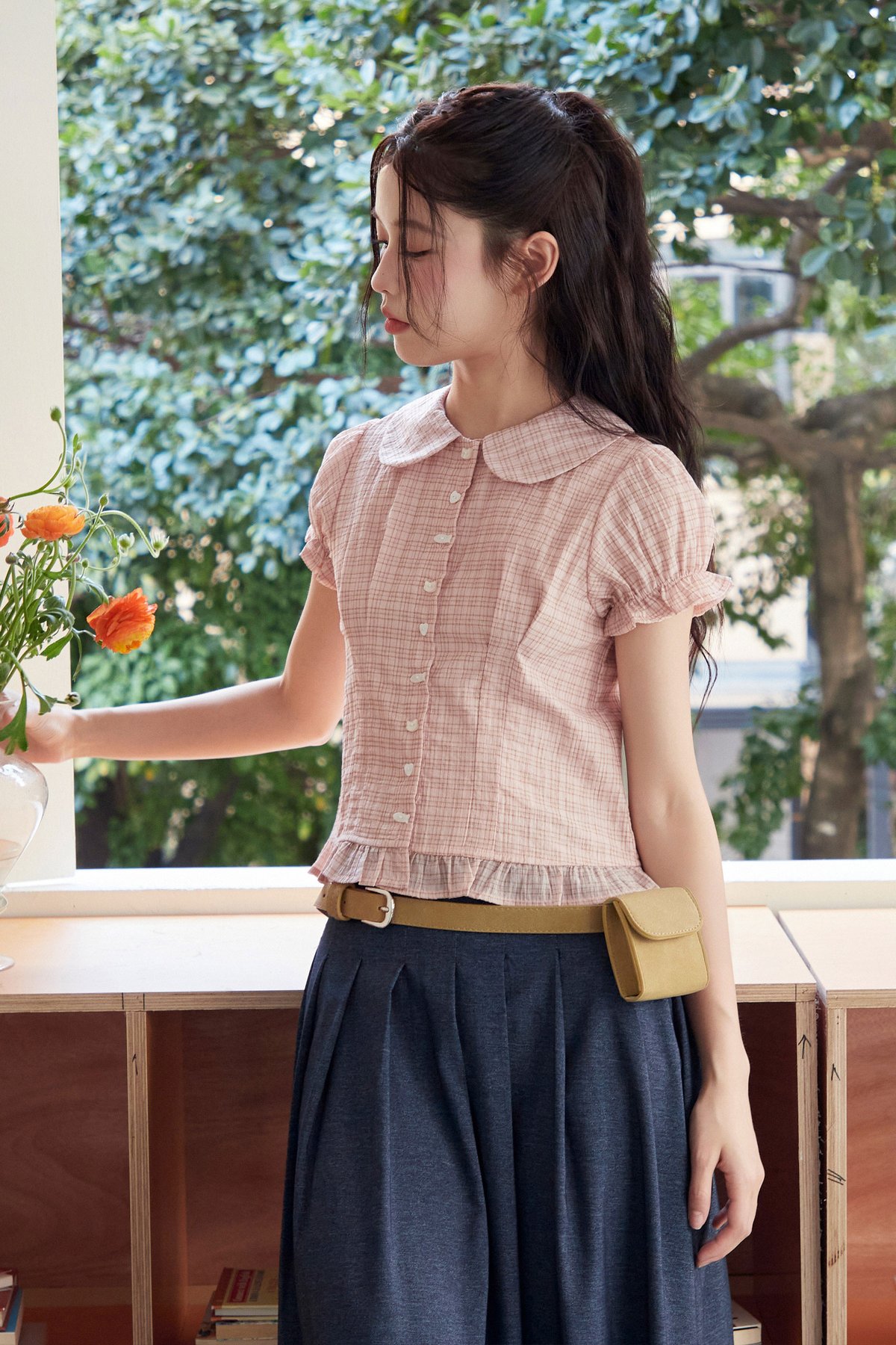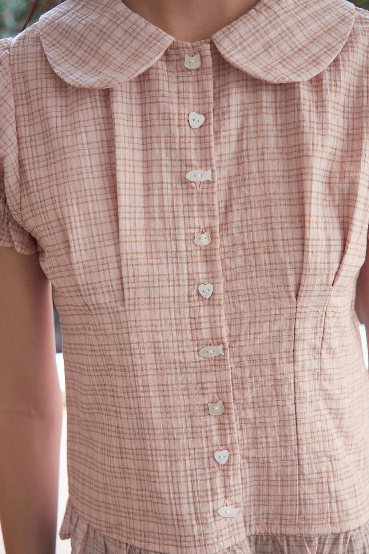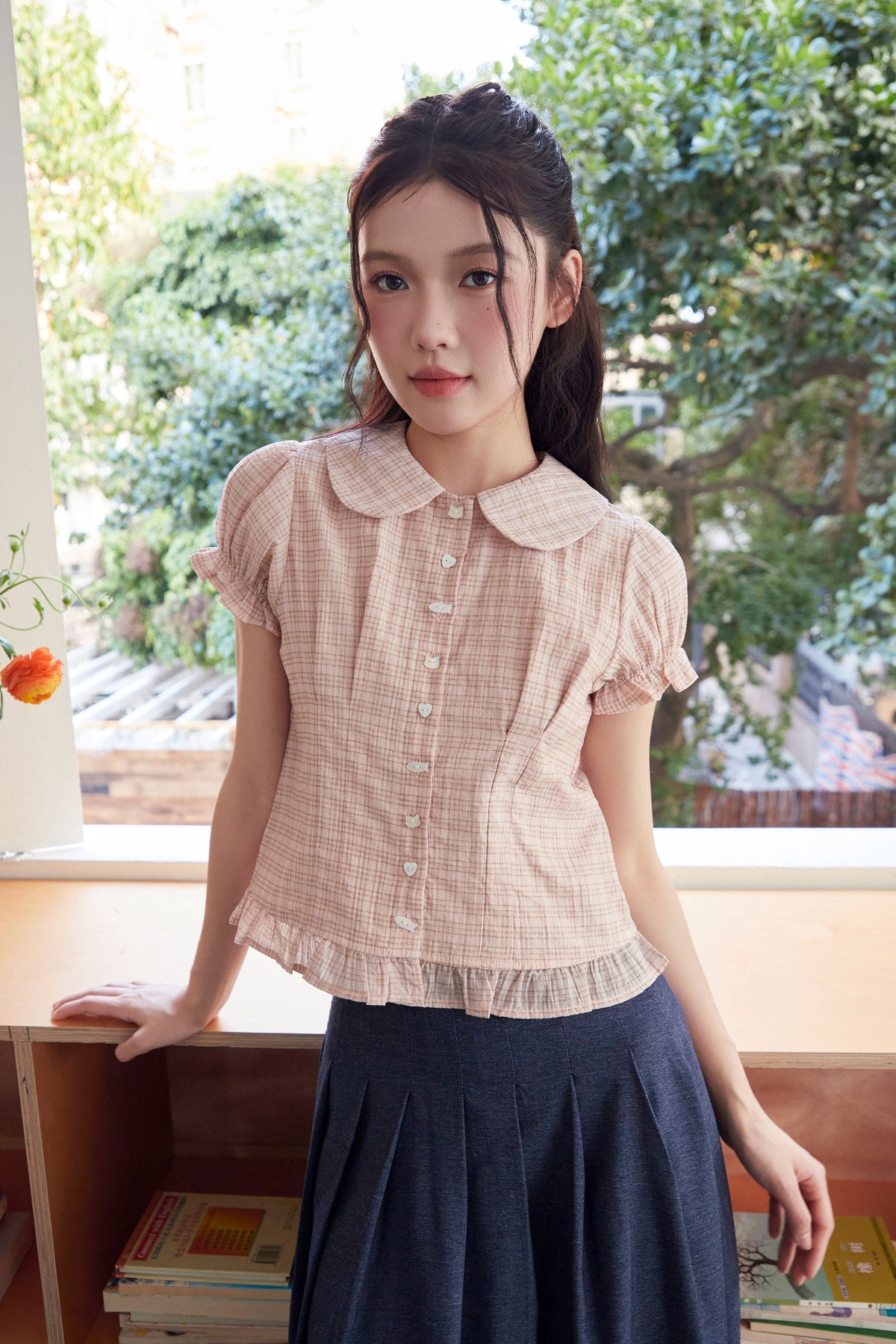 A Peter Pan collar top with functional front mis-matched buttons, ruffled hem, and elasticated sleeves.