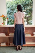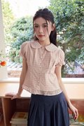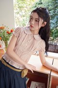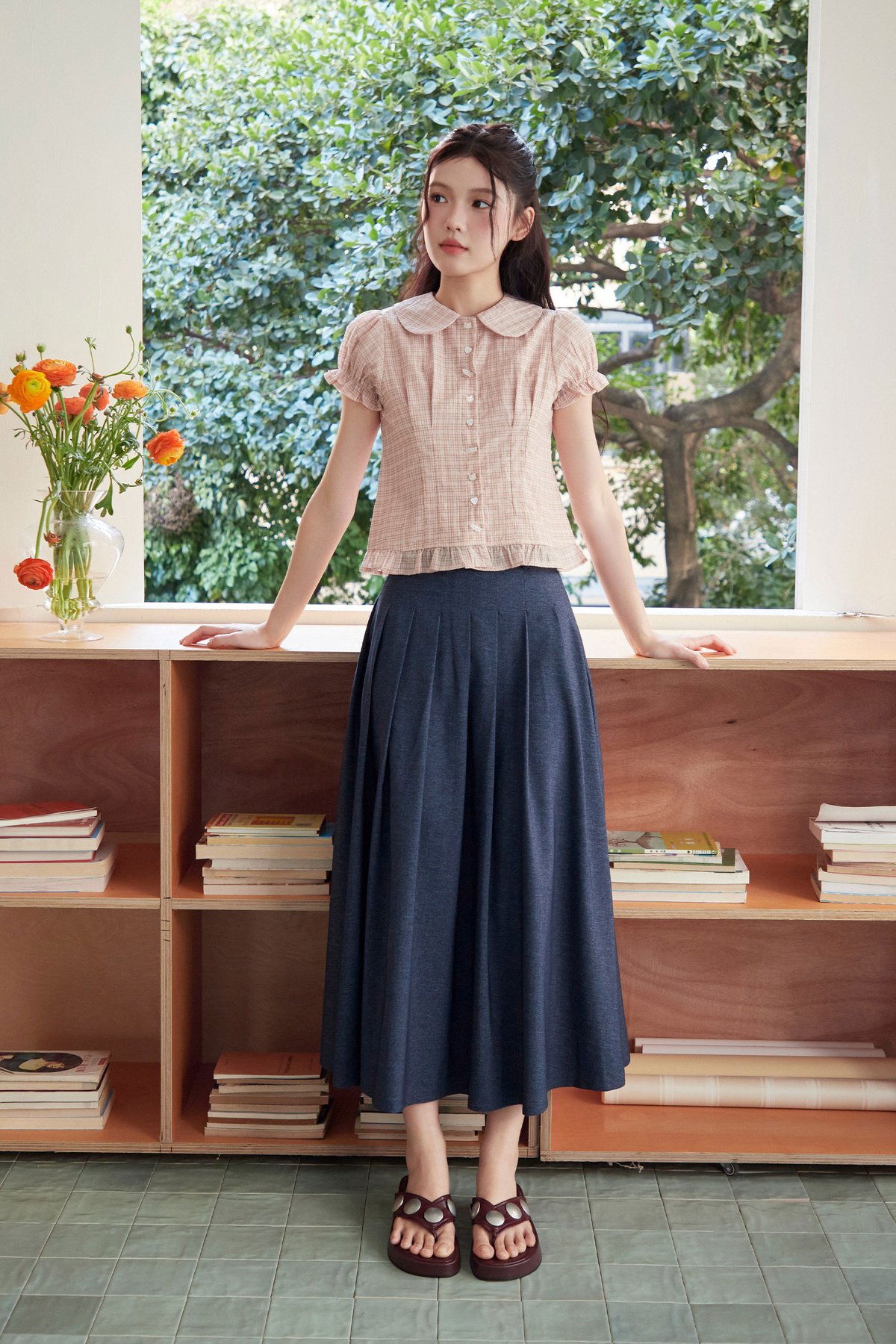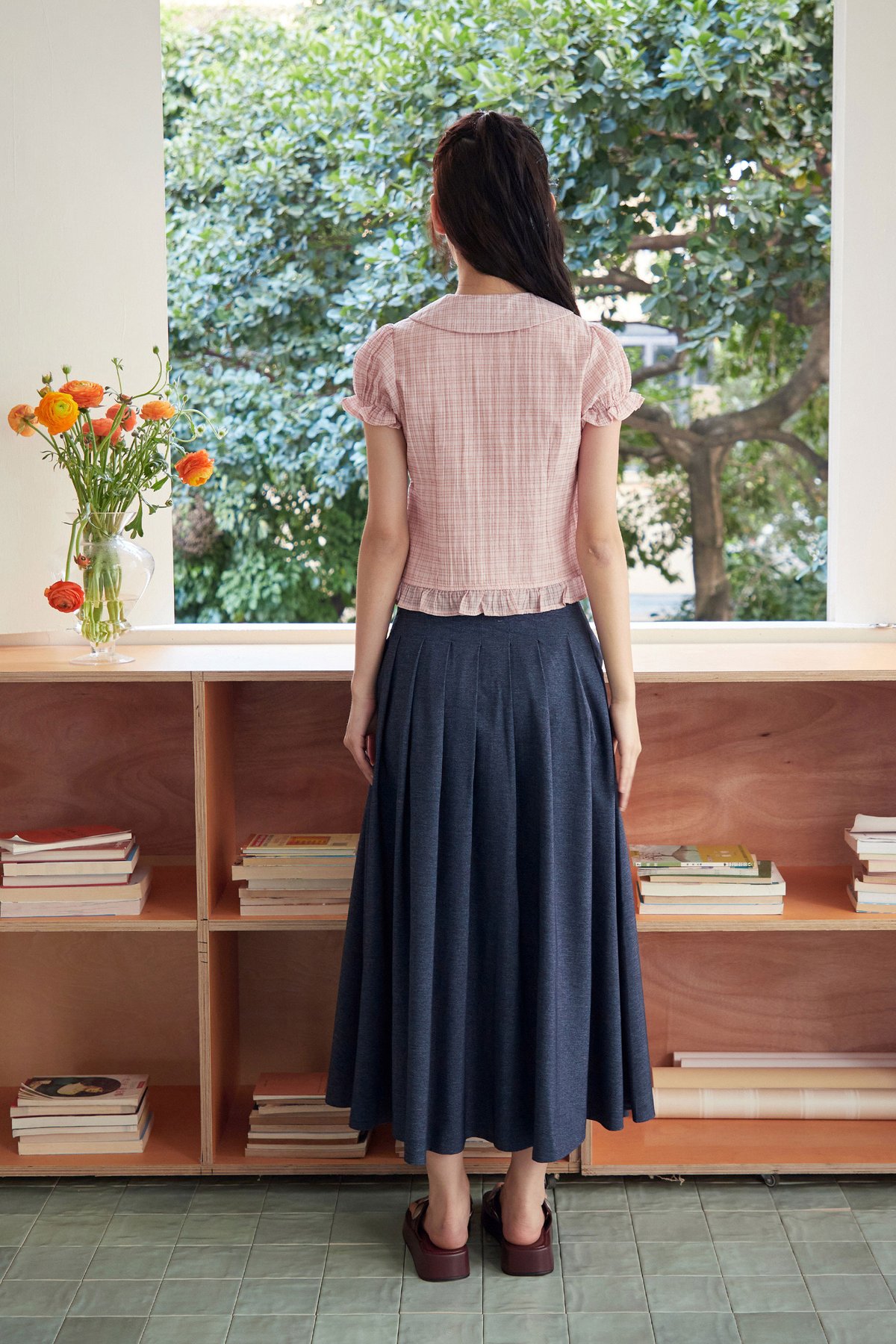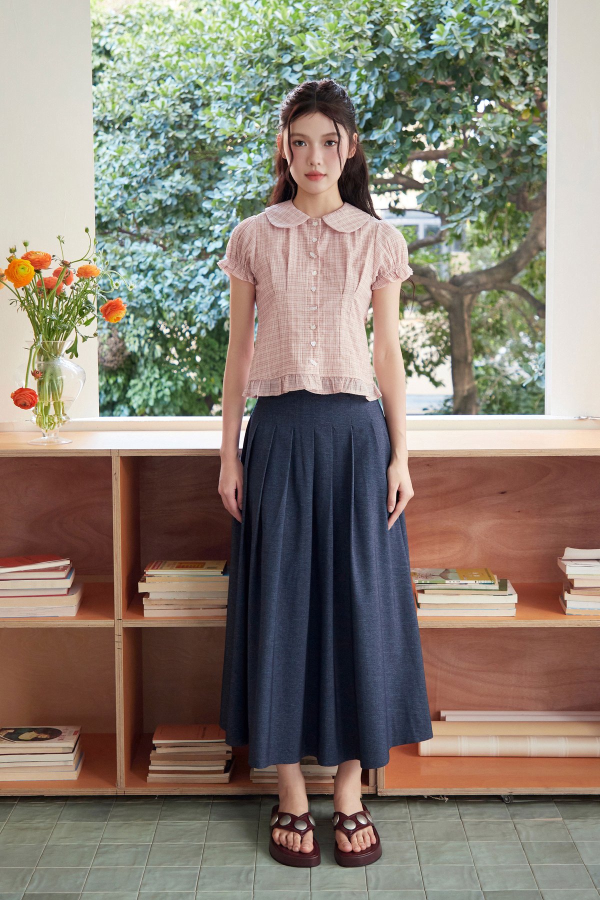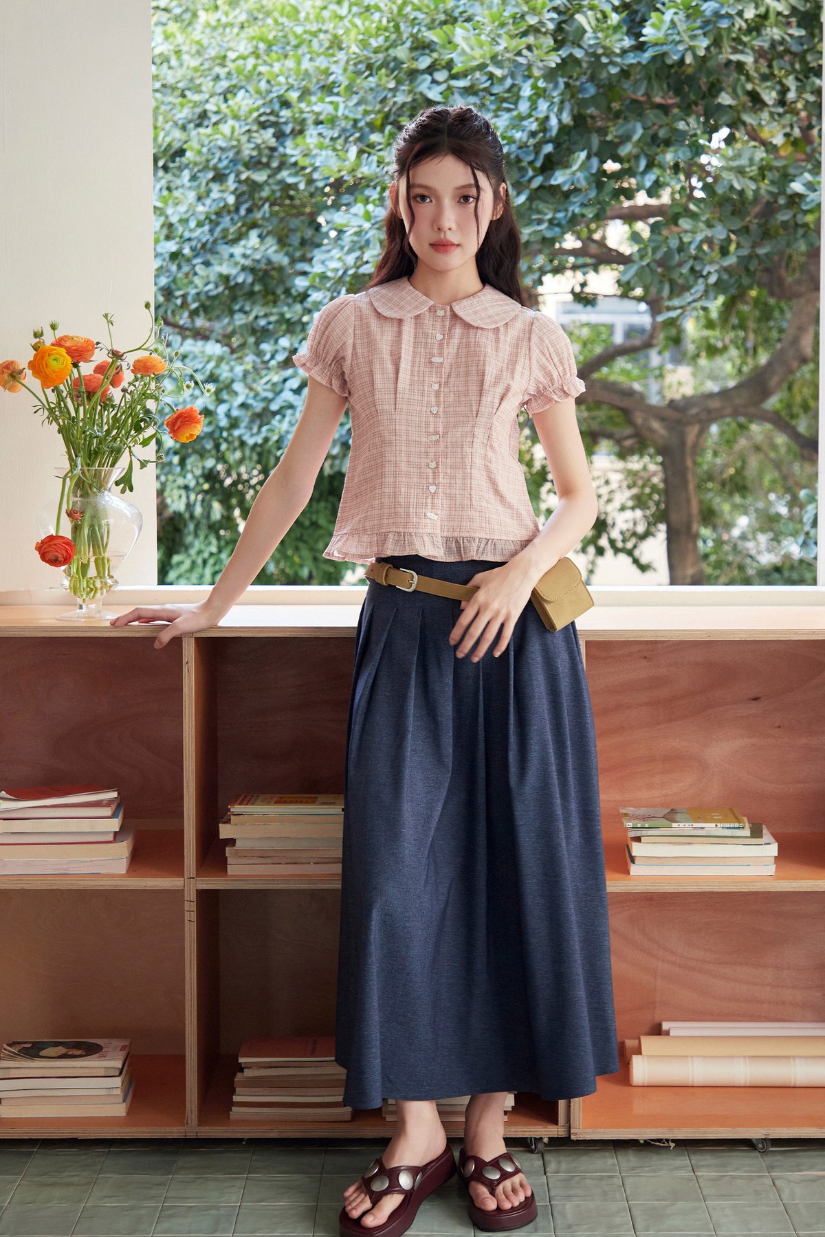 A Peter Pan collar top with functional front mis-matched buttons, ruffled hem, and elasticated sleeves.