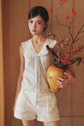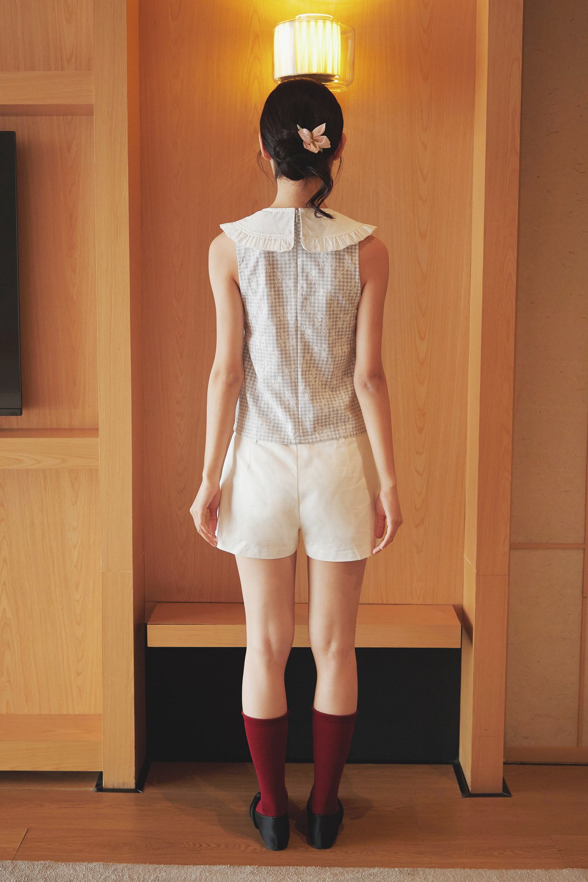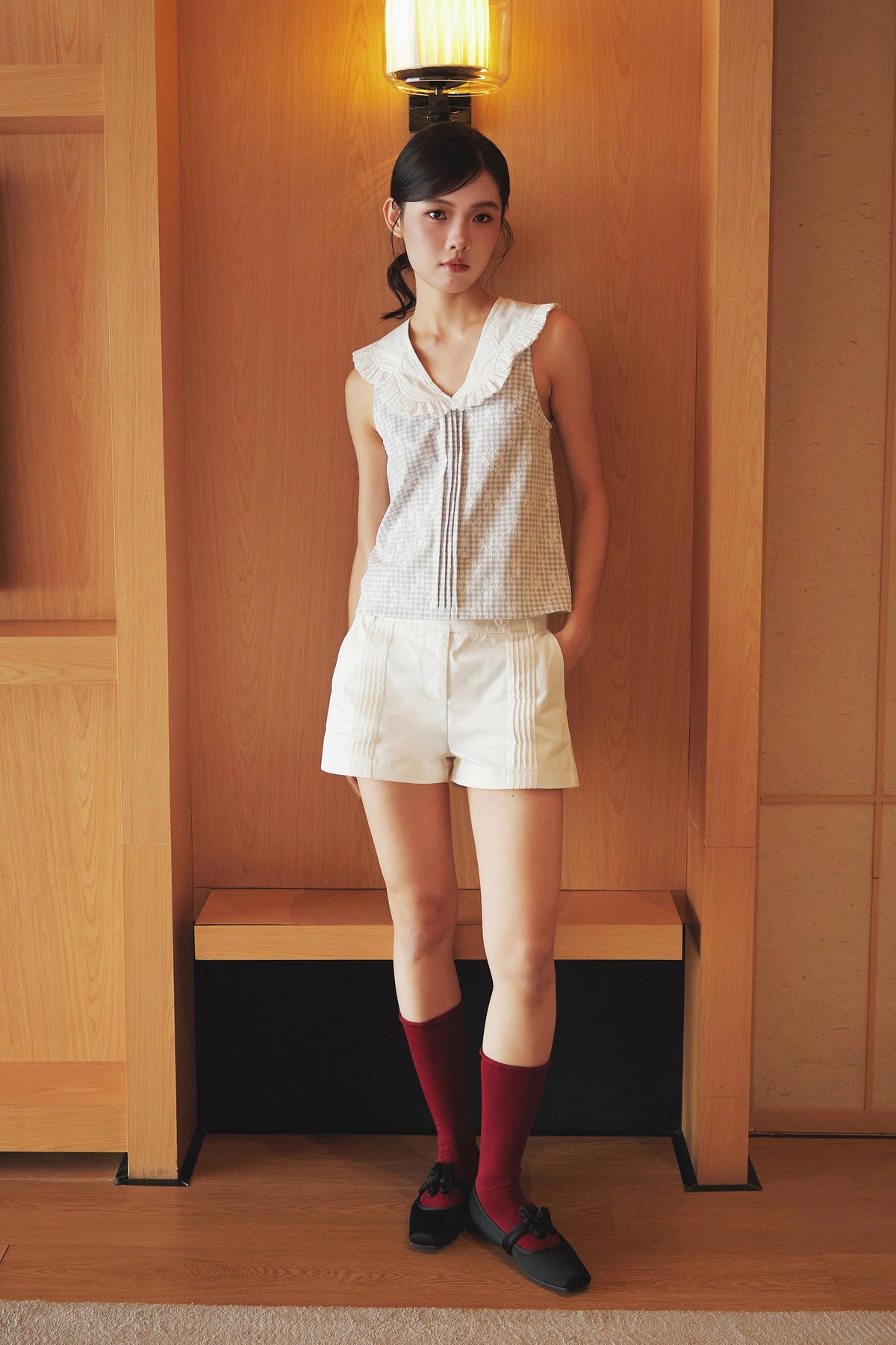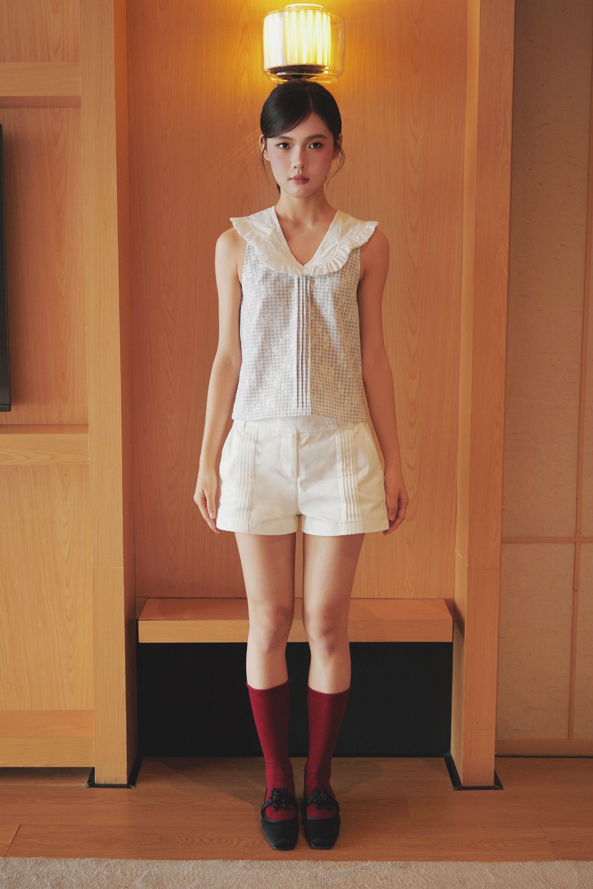 Designed with a back concealed zipper, front pintuck detailing, and a contrasting collar finished with ruffle details.