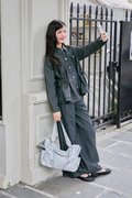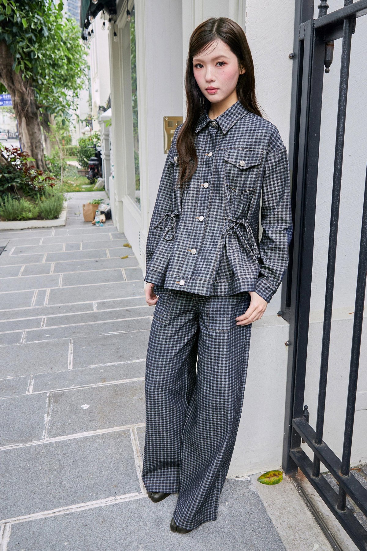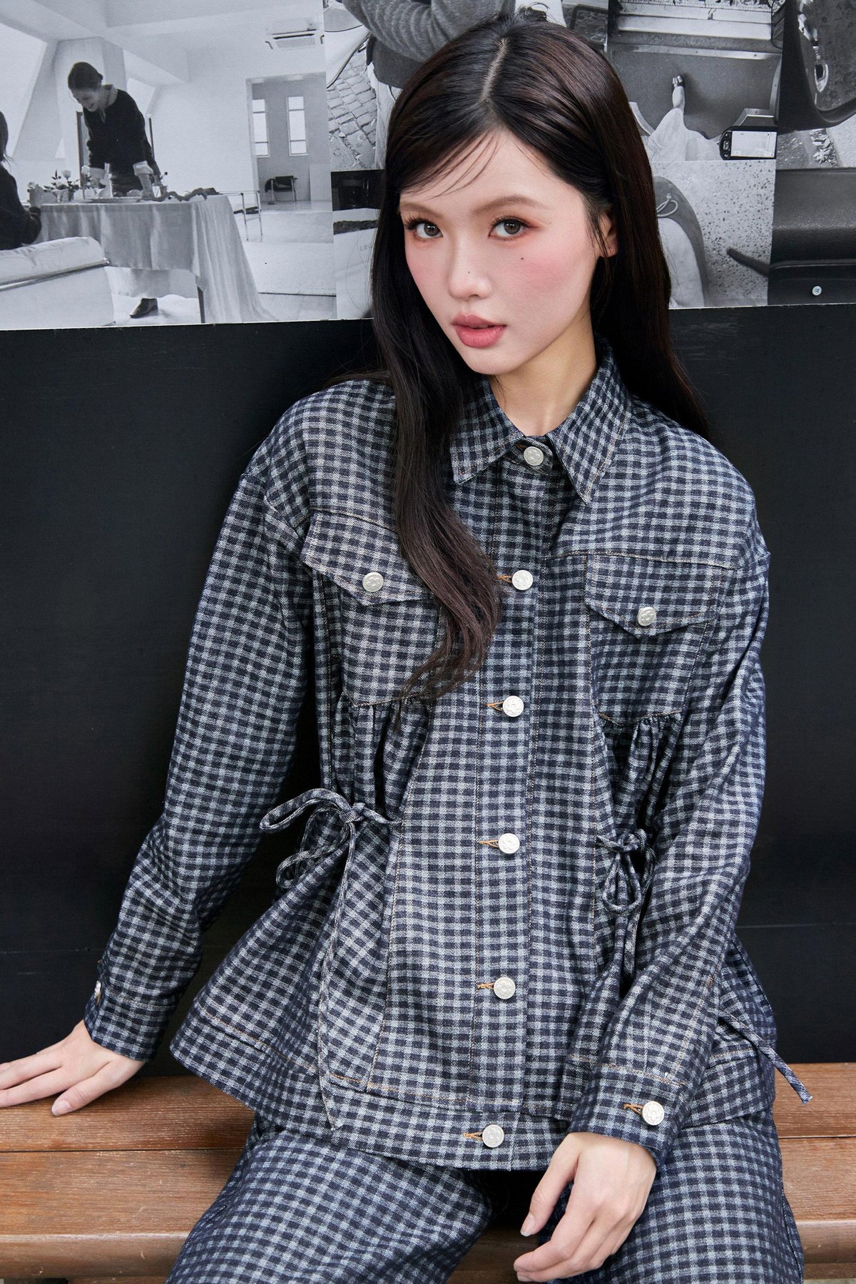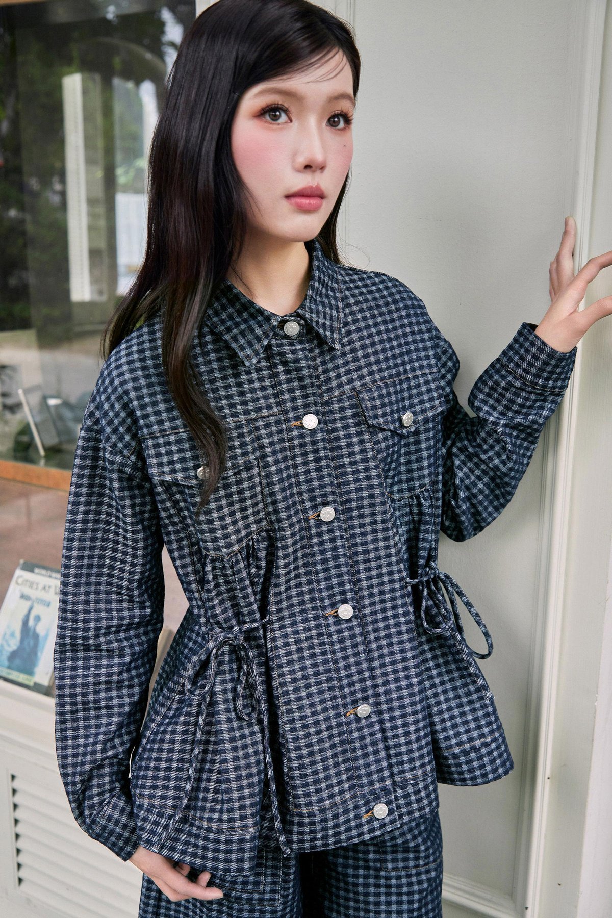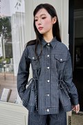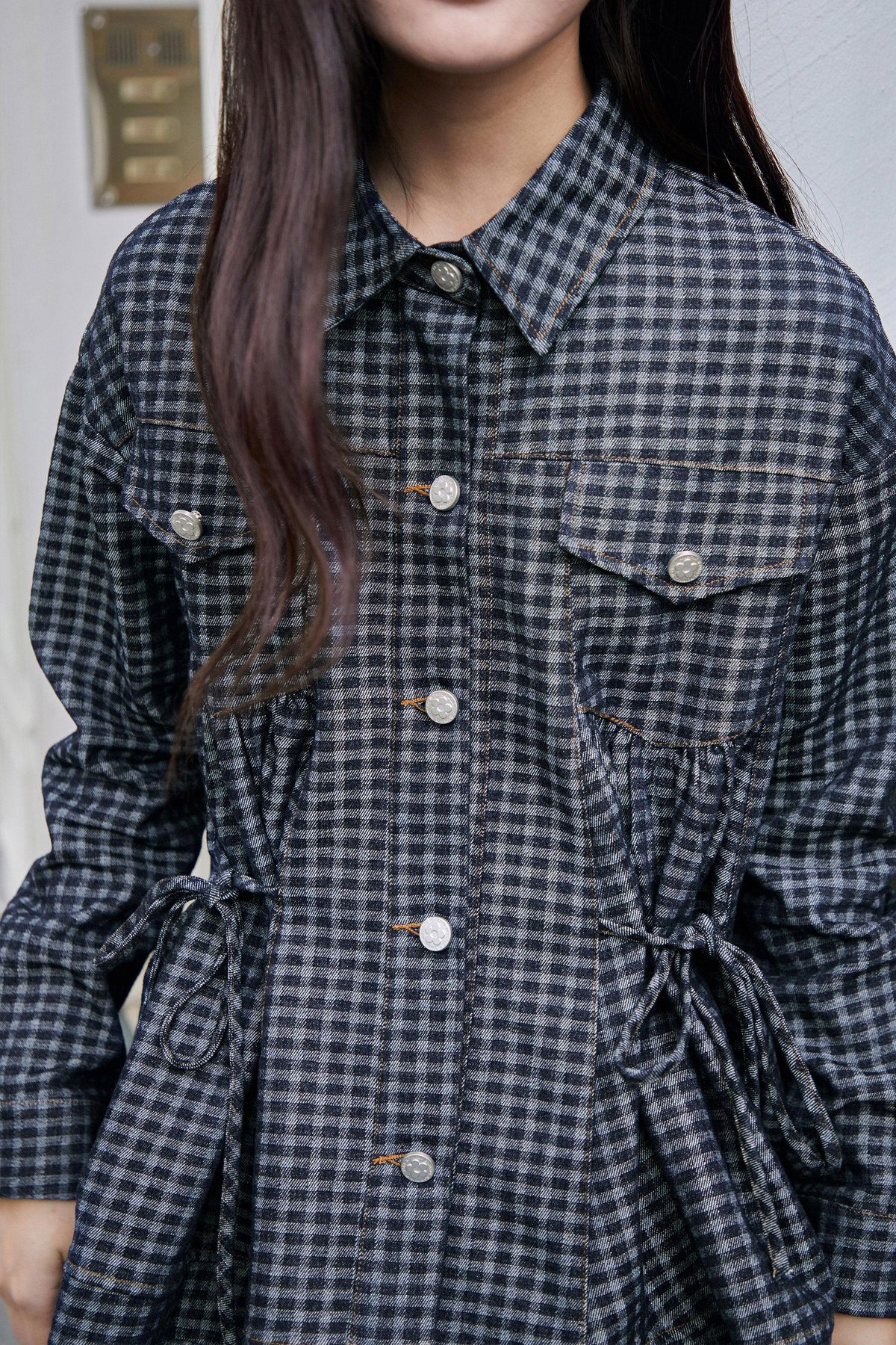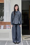 A denim jacket featuring functional front rivet buttons and side pockets, with faux chest pockets for added detail. It includes an adjustable ribbon tie at both the front and back, allowing for a custom fit. Gathered detailing at the front and back yoke adds a touch of texture and dimension.