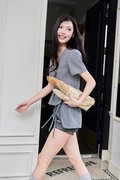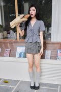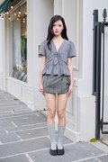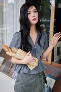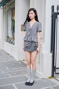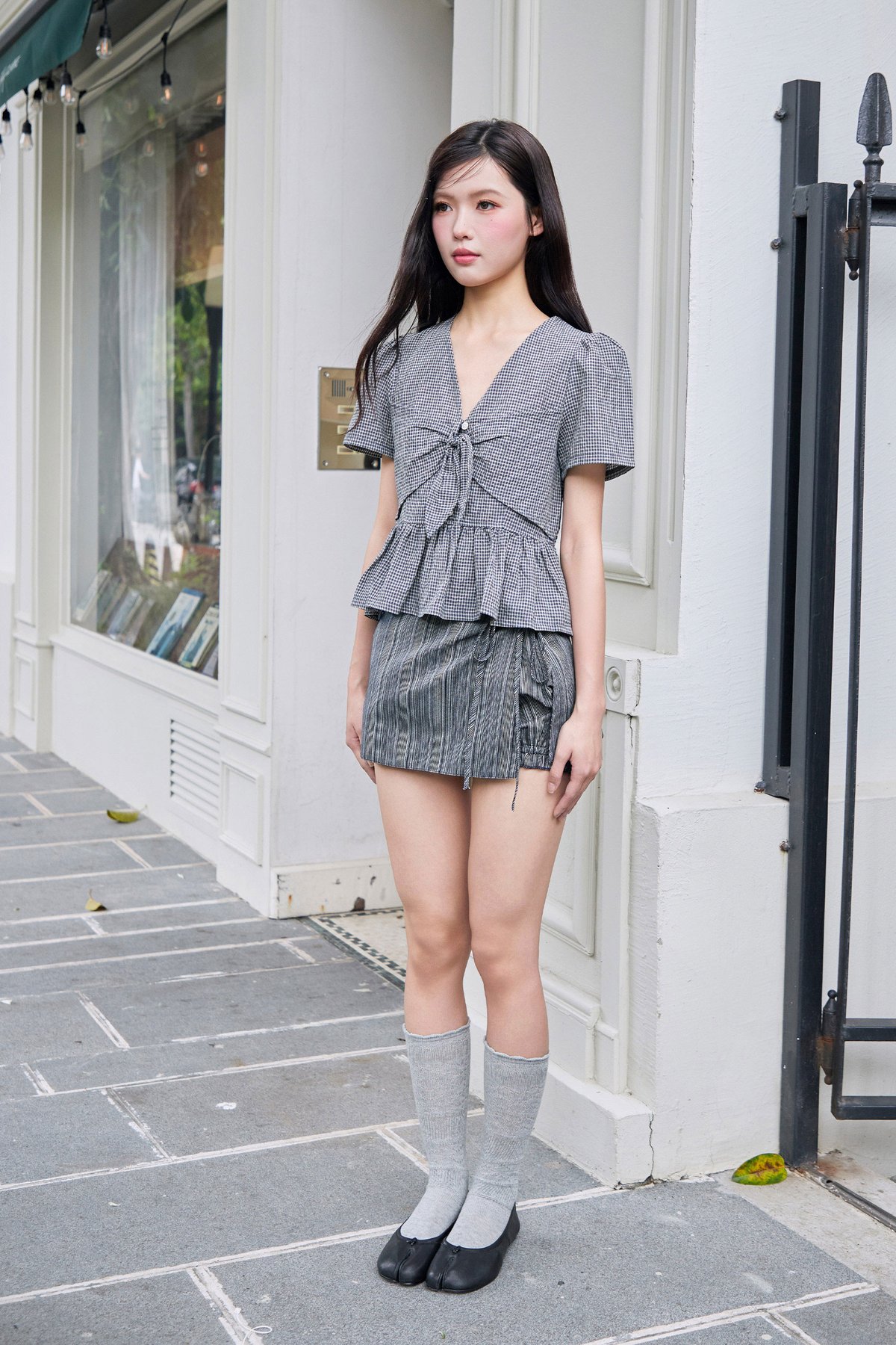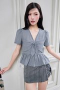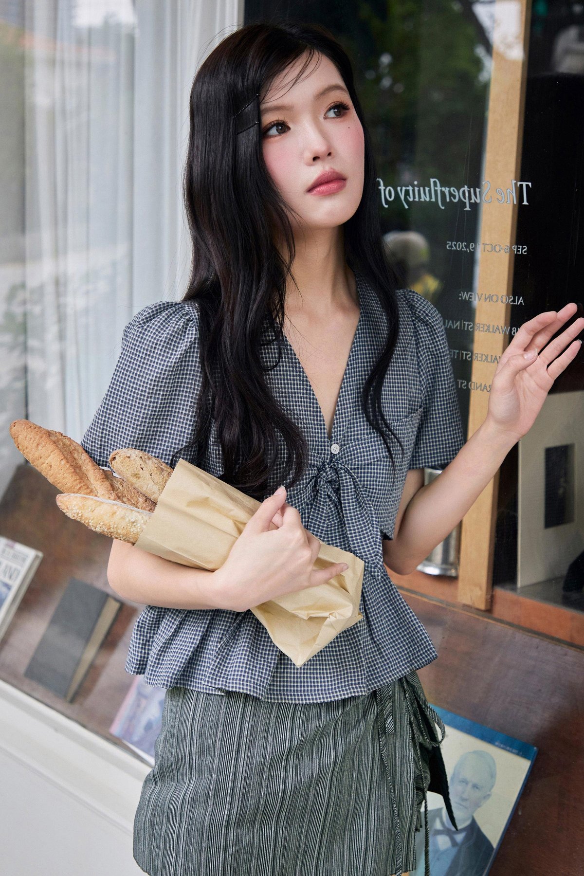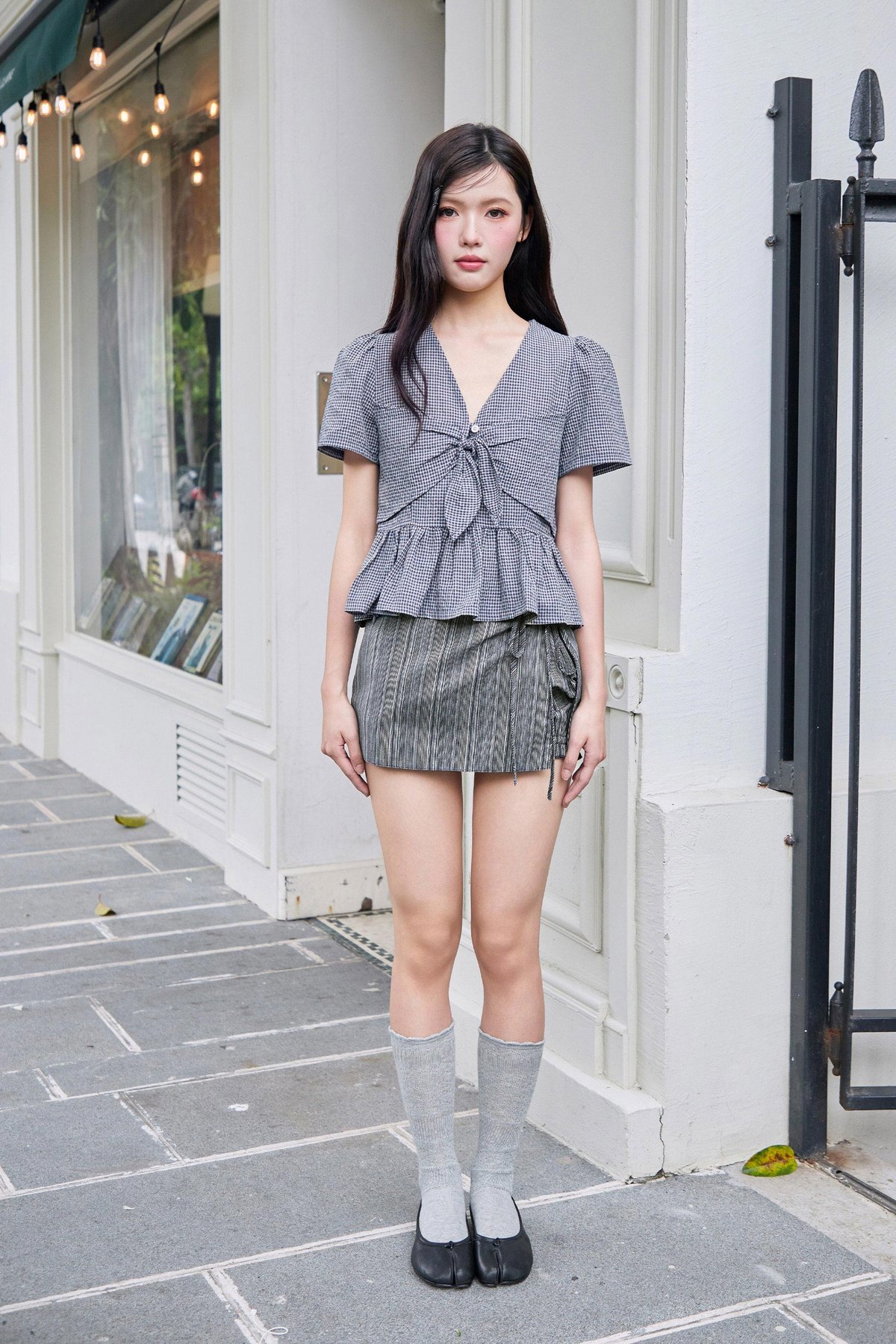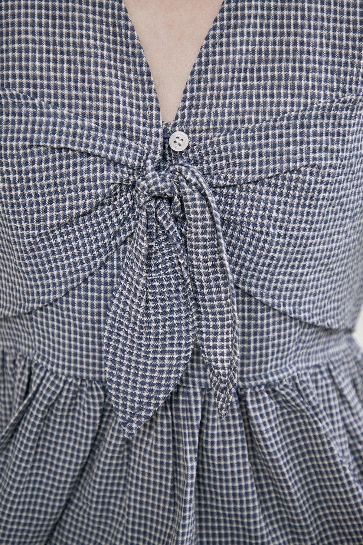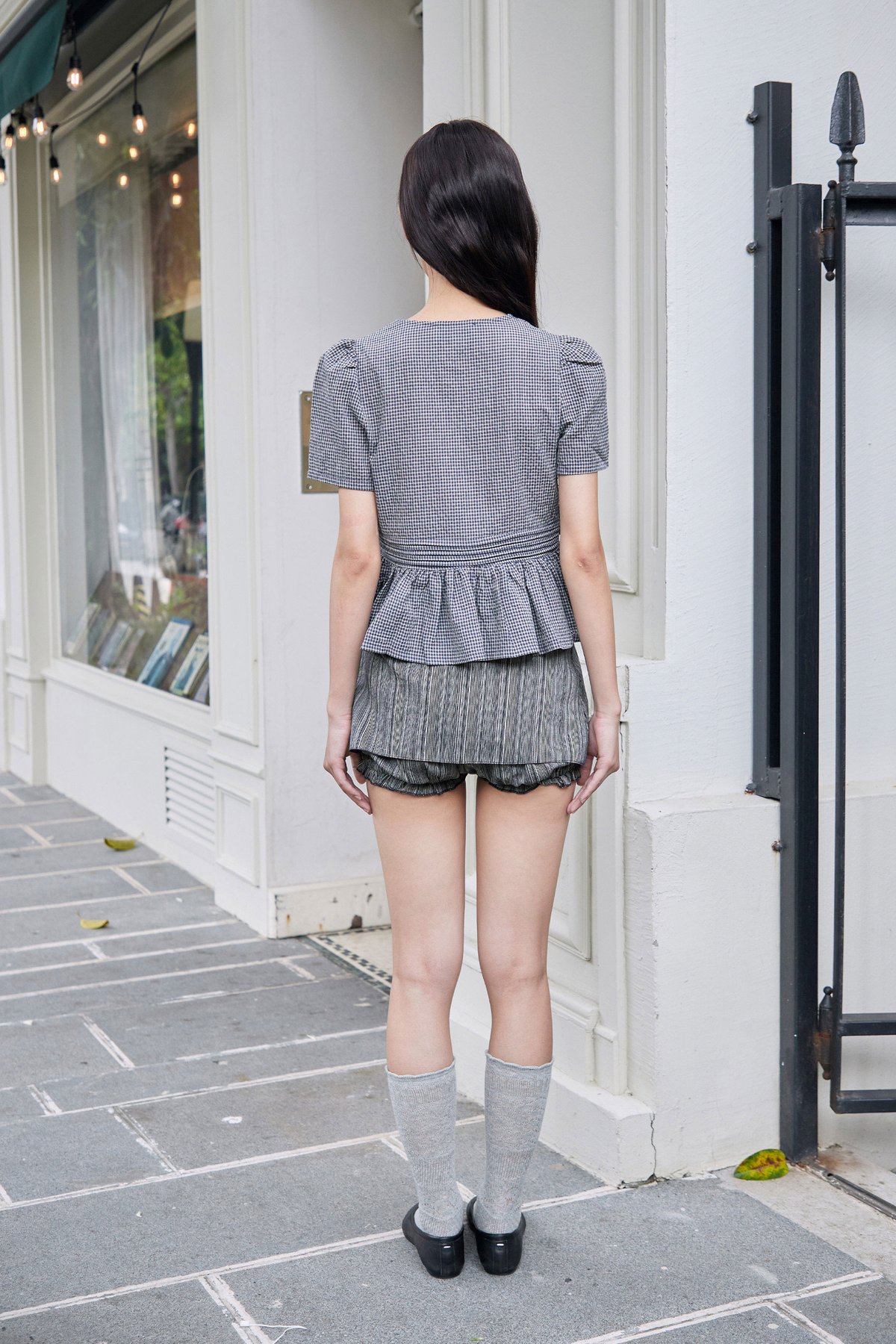 Peplum top with functional front buttons, faux ribbon tie detail, and pintuck accents at the back waist.