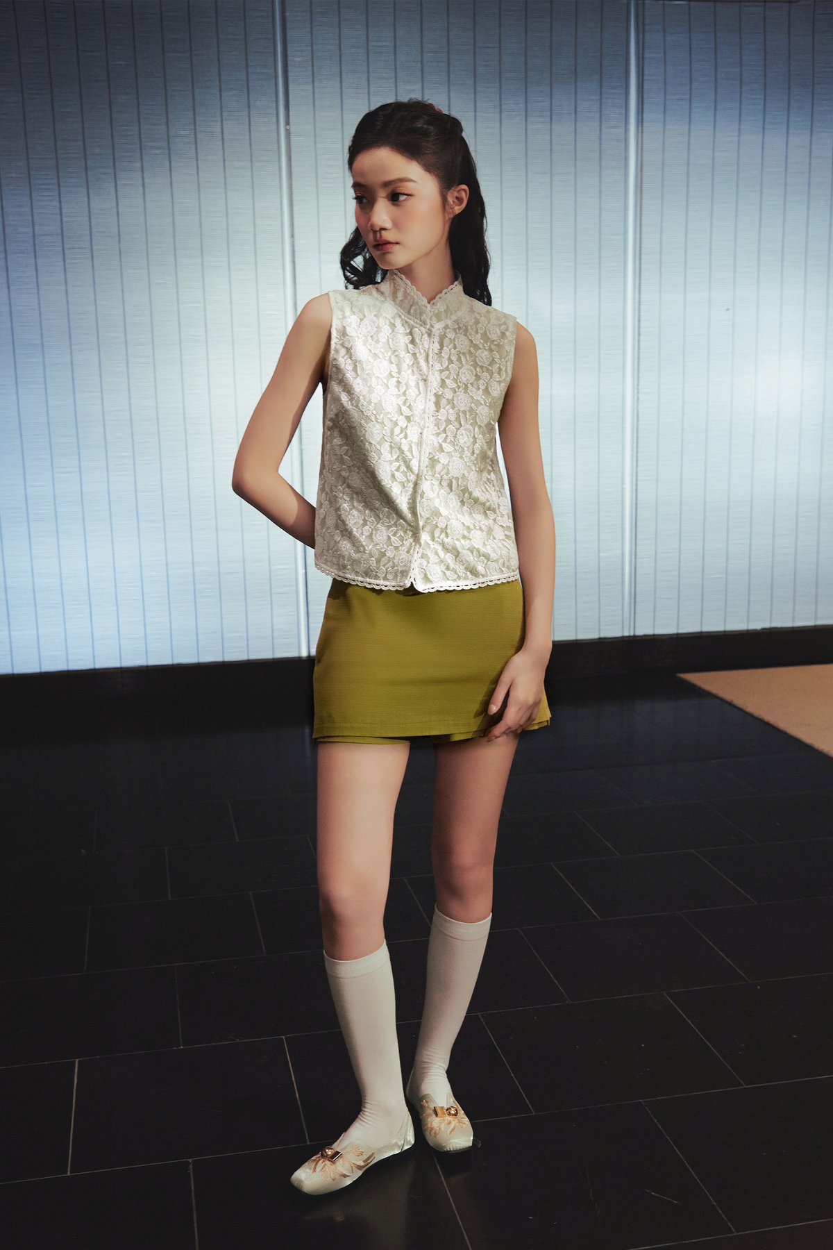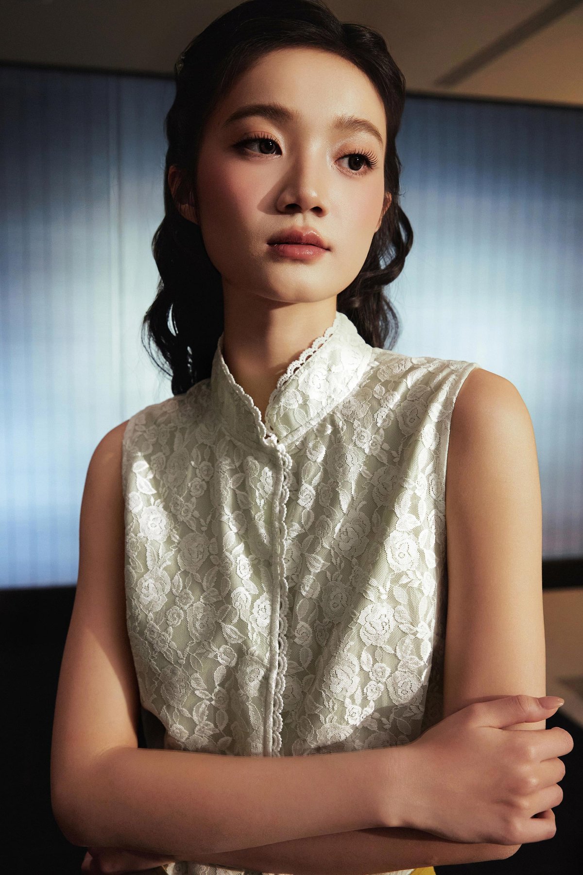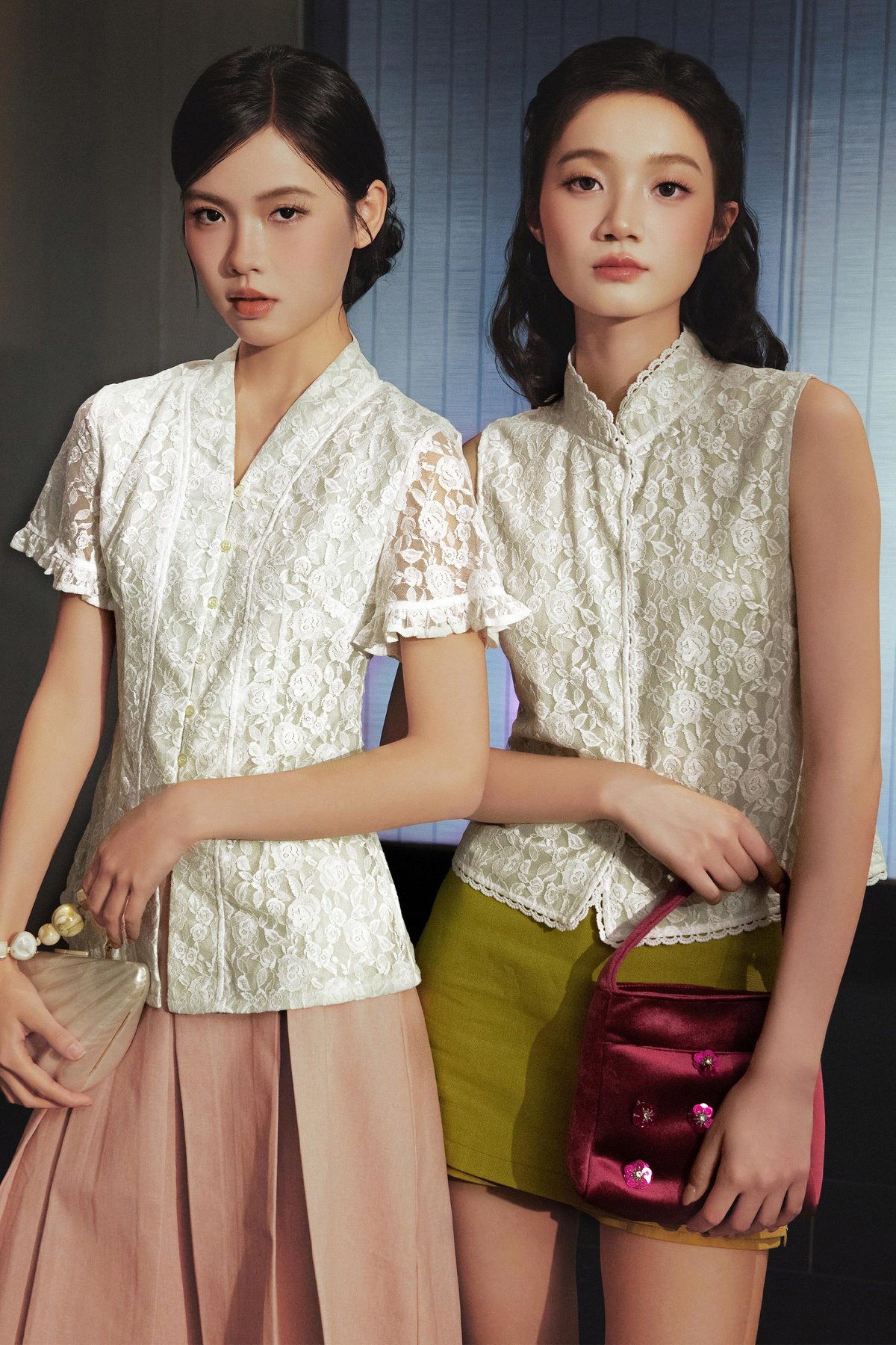 A fully lined top featuring a Chinese stand collar with delicate lace trimming along the collar, front opening, and hem. Designed with hidden snap buttons for a clean, polished finish.