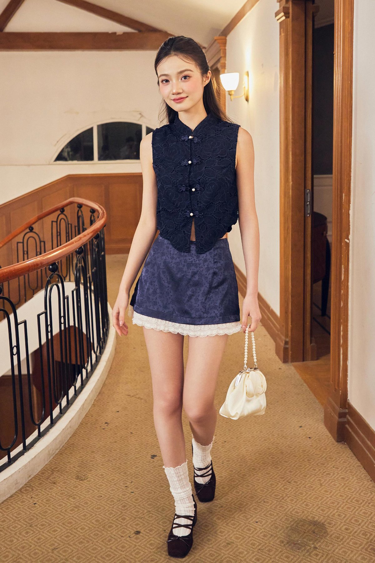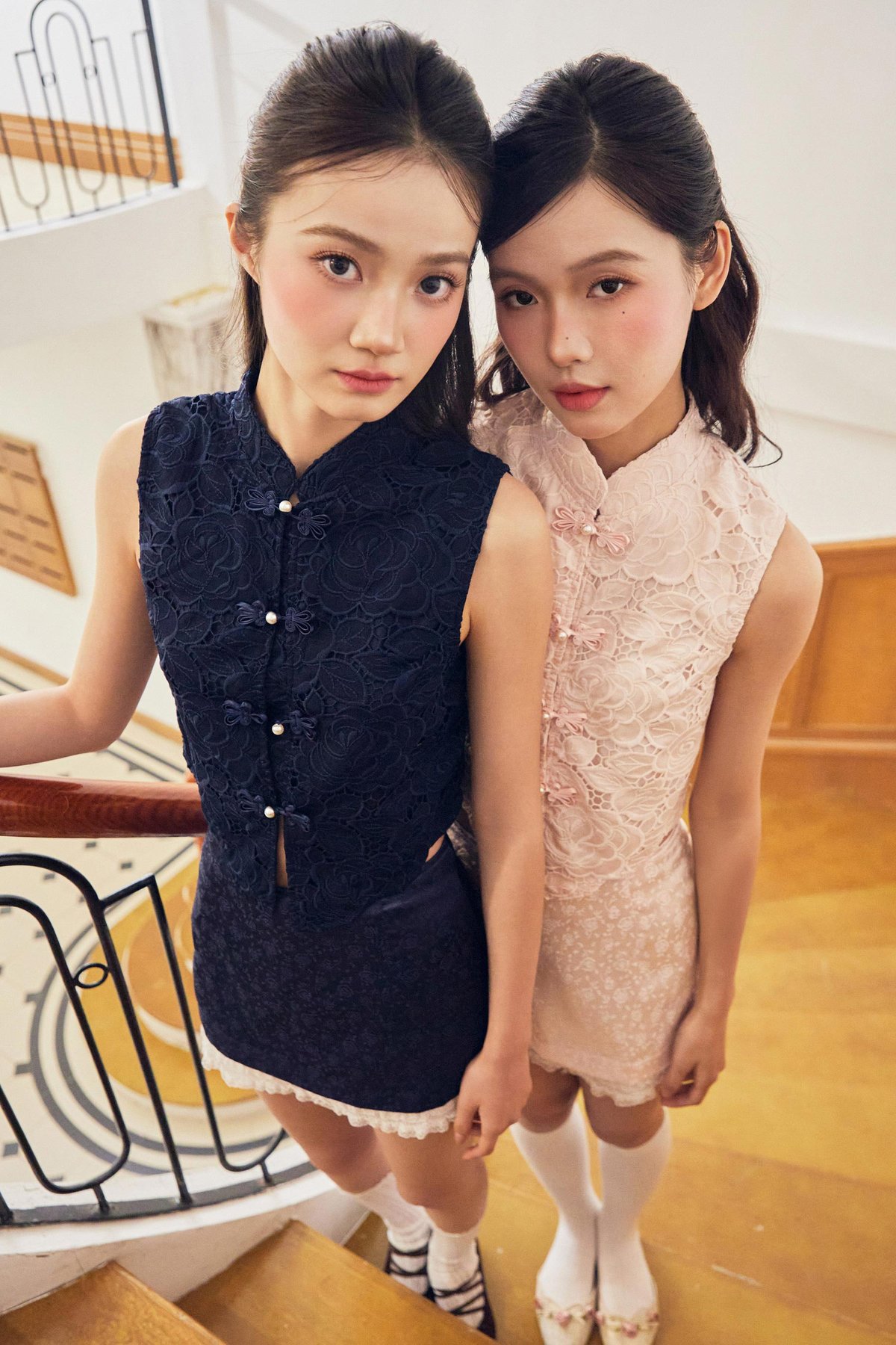 This cheongsam top features a Chinese stand collar with functional Chinese frog buttons for a classic, refined touch. Finished with a scalloped hem, it adds a subtle feminine detail to the timeless silhouette.