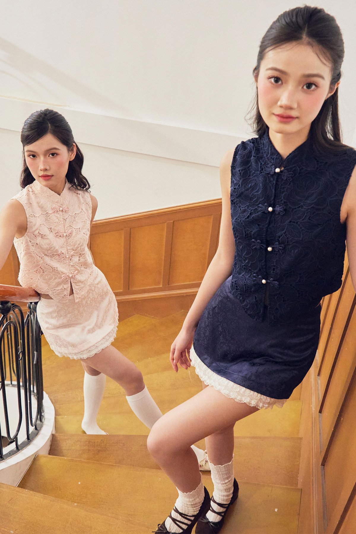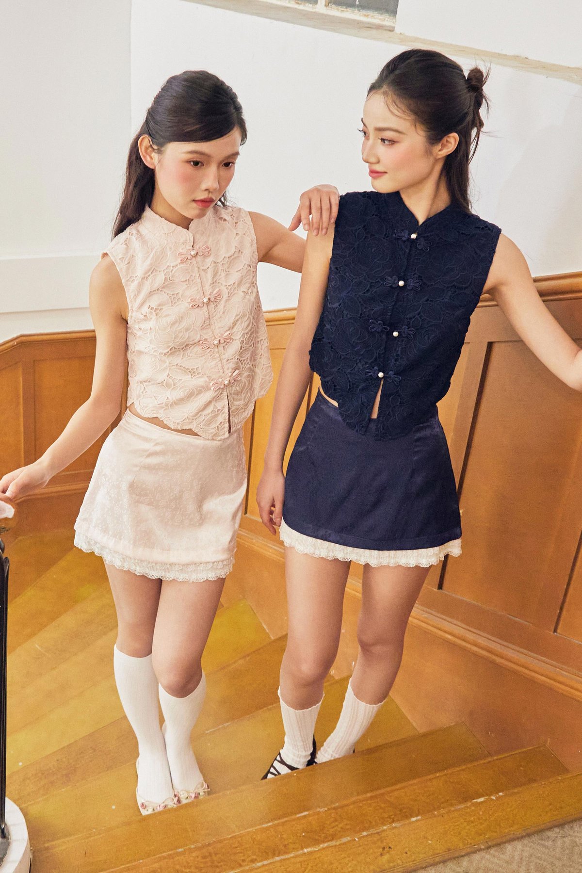 This cheongsam top features a Chinese stand collar with functional Chinese frog buttons for a classic, refined touch. Finished with a scalloped hem, it adds a subtle feminine detail to the timeless silhouette.